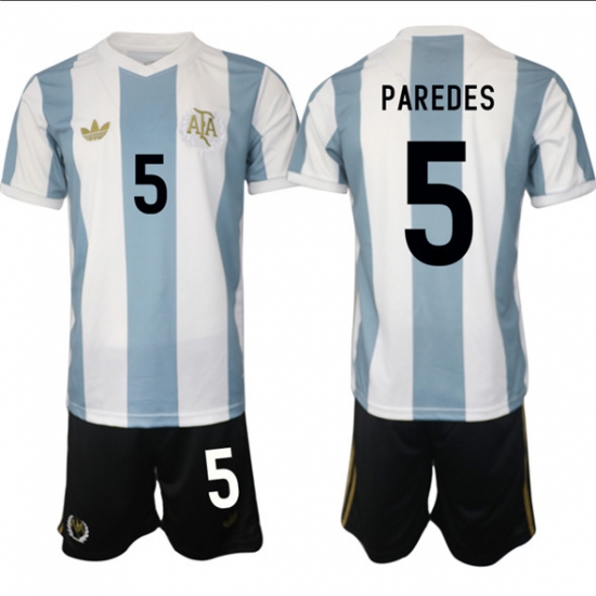 >Men's Argentina #5 Leandro Paredes White Blue 2024-25 50th Anniversary Home Soccer Jersey Suit