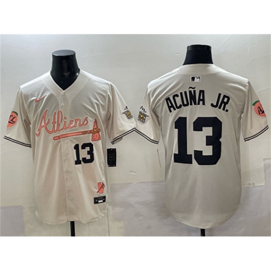 >Men's Atlanta Braves #13 Ronald Acuna Jr. Cream 2024 Atliens & Peach With Outkast Vapor Limited Stitched Baseball Jersey