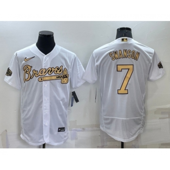>Men's Atlanta Braves #7 Dansby Swanson White 2022 All Star Stitched Flex Base Nike Jersey