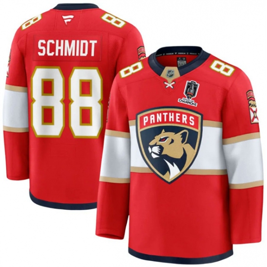 Men's Florida Panthers #88 Nate Schmidt Red Home 2025 Stanley Cup Champions Stitched Jersey