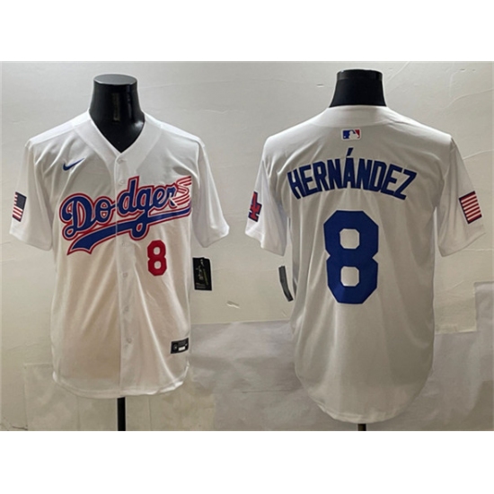 >Men's Los Angeles Dodgers #8 Enrique Hernández White With American Flag Limited Stitched Baseball Jersey