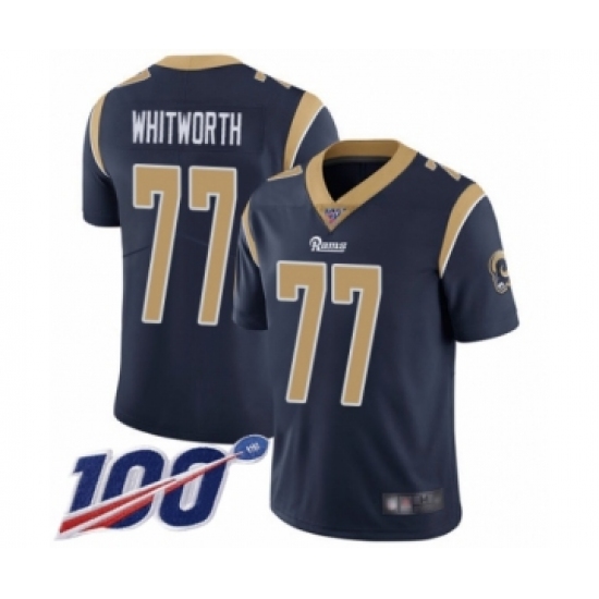 >Men's Los Angeles Rams #77 Andrew Whitworth Navy Blue Team Color Vapor Untouchable Limited Player 100th Season Football Jersey
