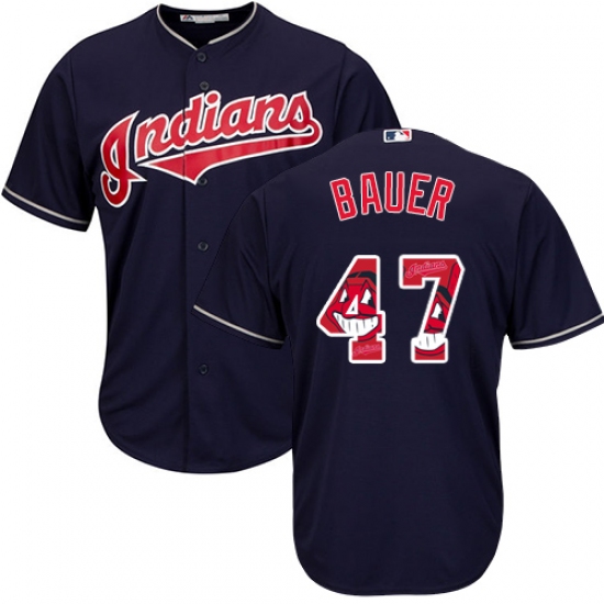 Men's Majestic Cleveland Indians #47 Trevor Bauer Authentic Navy Blue Team Logo Fashion Cool Base MLB Jersey