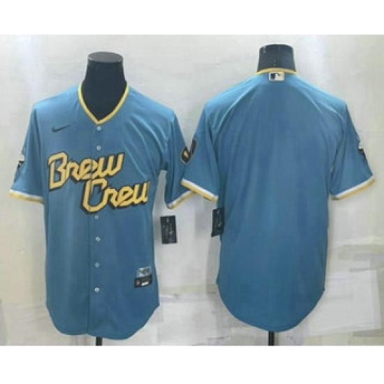 >Men's Milwaukee Brewers Blank Blue 2022 City Connect Cool Base Stitched Jersey