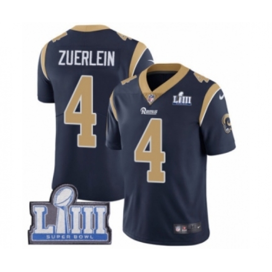 >Men's Nike Los Angeles Rams #4 Greg Zuerlein Navy Blue Team Color Vapor Untouchable Limited Player Super Bowl LIII Bound NFL Jersey