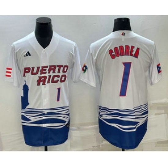 Men's Puerto Rico Baseball #1 Carlos Correa Number White 2023 World Baseball Classic Stitched Jersey