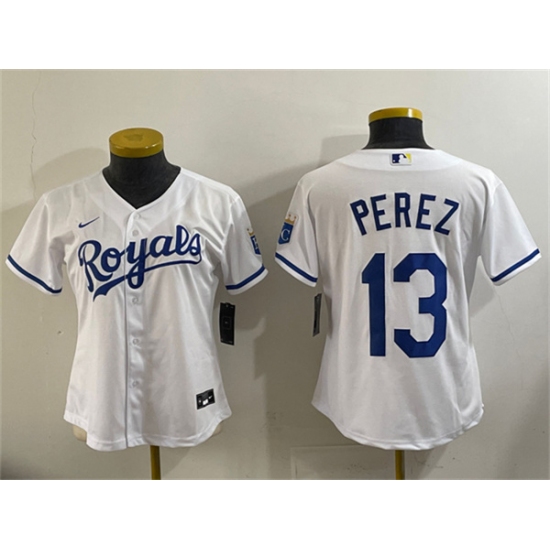 >Women's Kansas City Royals #13 Salvador Perez White Cool Base Stitched Jersey(Run Small)