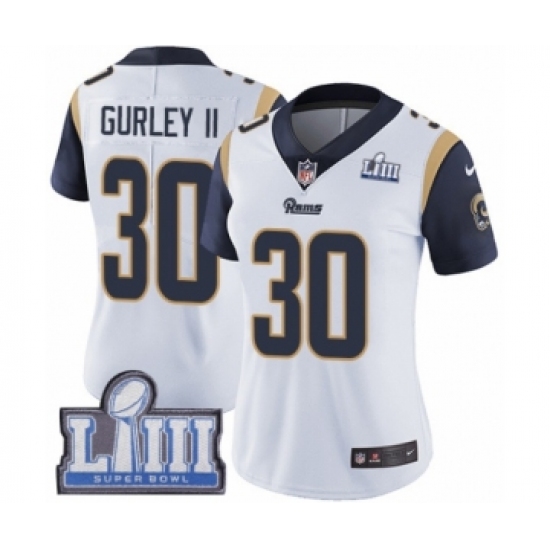 >Women's Nike Los Angeles Rams #30 Todd Gurley White Vapor Untouchable Limited Player Super Bowl LIII Bound NFL Jersey