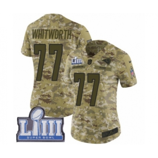 >Women's Nike Los Angeles Rams #77 Andrew Whitworth Limited Camo 2018 Salute to Service Super Bowl LIII Bound NFL Jersey
