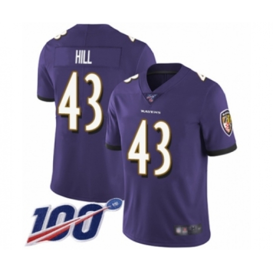 Men's Baltimore Ravens #43 Justice Hill Purple Team Color Vapor Untouchable Limited Player 100th Season Football Jersey