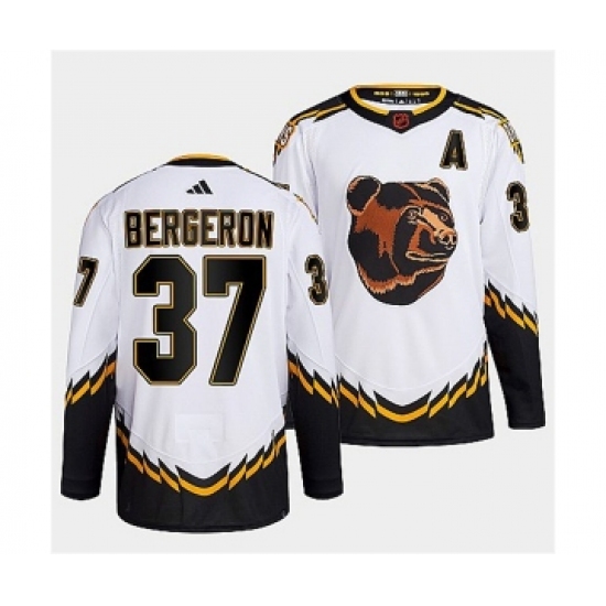 >Men's Boston Bruins #37 Patrice Bergeron 2022 White Reverse Retro Stitched Jersey