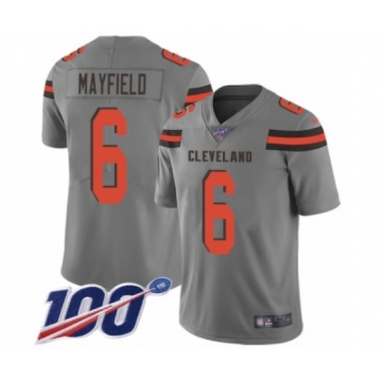 >Men's Cleveland Browns #6 Baker Mayfield Limited Gray 100th Season Inverted Legend Football Jersey