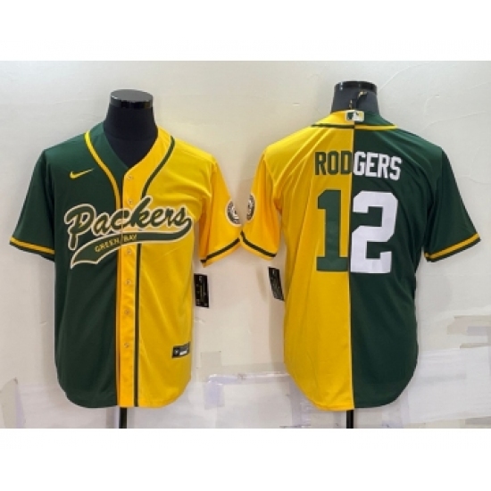 Men's Green Bay Packers #12 Aaron Rodgers Green Yellow Split With Patch Cool Base Stitched Baseball Jersey