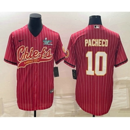 Men's Kansas City Chiefs #10 Isiah Pacheco Red Pinstripe With Super Bowl LVII Patch Cool Base Stitched Baseball Jersey