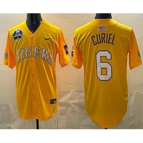 >Men's LSU Tigers #6 Derek Curiel Gold 2025 World Series SEC Stitched Baseball Jersey