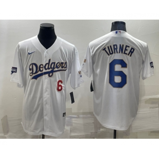 Men's Los Angeles Dodgers #6 Trea Turner Number White Gold Championship Stitched MLB Cool Base Nike Jersey