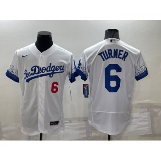 >Men's Los Angeles Dodgers #6 Trea Turner White 2022 City Connect Flex Base Stitched Jersey