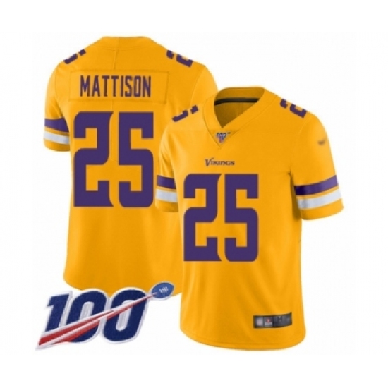 >Men's Minnesota Vikings #25 Alexander Mattison Limited Gold Inverted Legend 100th Season Football Jersey