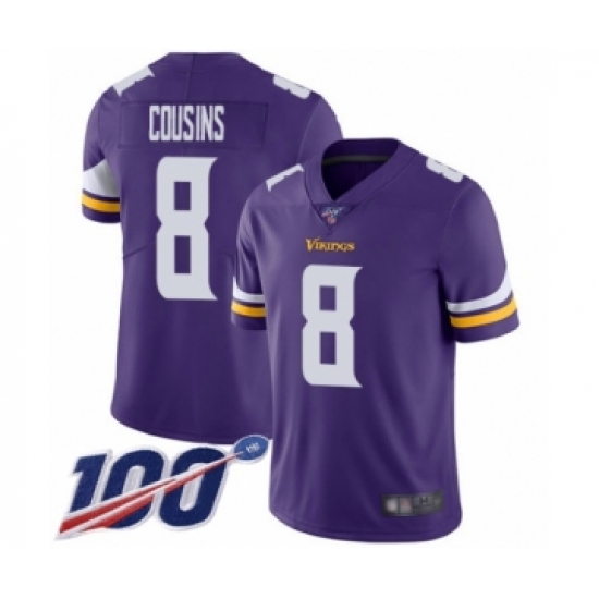 Men's Minnesota Vikings #8 Kirk Cousins Purple Team Color Vapor Untouchable Limited Player 100th Season Football Jersey