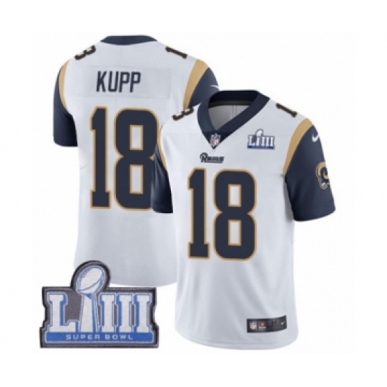 >Men's Nike Los Angeles Rams #18 Cooper Kupp White Vapor Untouchable Limited Player Super Bowl LIII Bound NFL Jersey