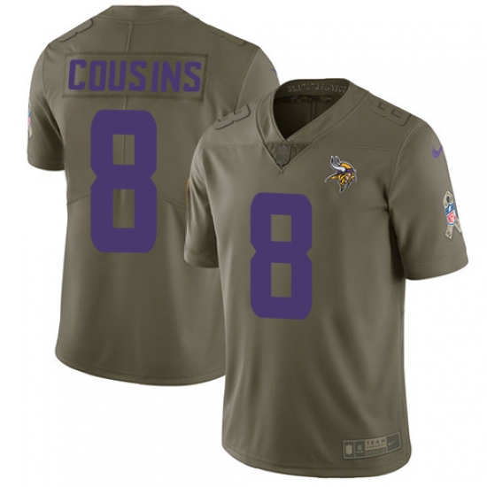 >Men's Nike Minnesota Vikings #8 Kirk Cousins Limited Olive 2017 Salute to Service NFL Jersey