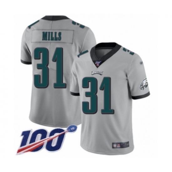 >Men's Philadelphia Eagles #31 Jalen Mills Limited Silver Inverted Legend 100th Season Football Jersey