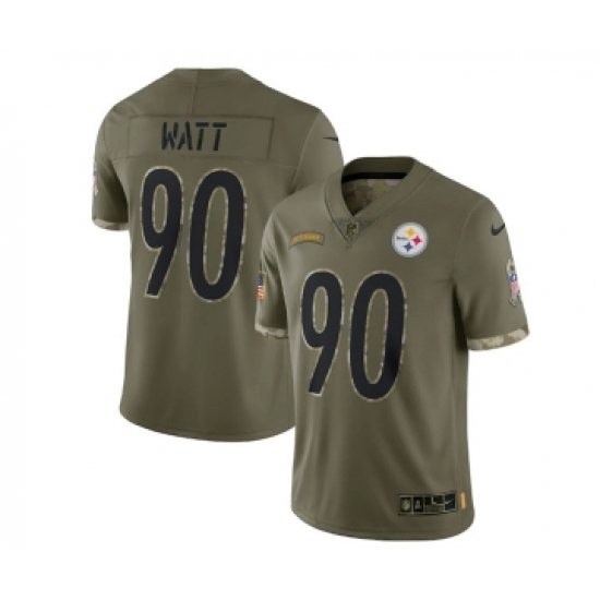 >Men's Pittsburgh Steelers #90 T. J. Watt 2022 Olive Salute To Service Limited Stitched Jersey