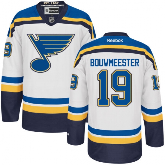 Home>NHL>St. Louis Blues>Jay Bouwmeester>Men's Reebok St. Louis Blues #19 Jay Bouwmeester Authentic White Away NHL Jersey
