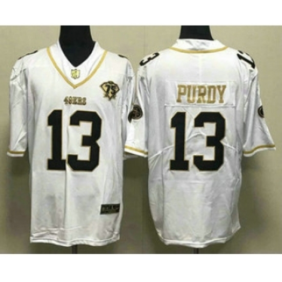 >Men's San Francisco 49ers #13 Brock Purdy White Gold With 75th Anniversary Stitched Jersey
