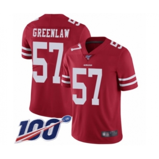 Men's San Francisco 49ers #57 Dre Greenlaw Red Team Color Vapor Untouchable Limited Player 100th Season Football Jersey