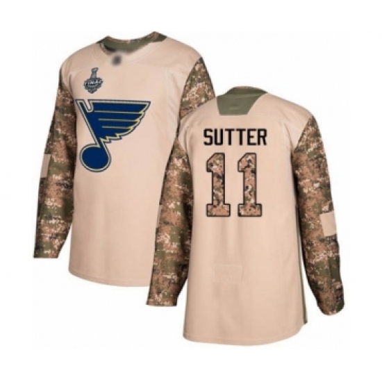 >Men's St. Louis Blues #11 Brian Sutter Authentic Camo Veterans Day Practice 2019 Stanley Cup Final Bound Hockey Jersey