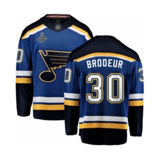 >Men's St. Louis Blues #30 Martin Brodeur Fanatics Branded Royal Blue Home Breakaway 2019 Stanley Cup Champions Hockey Jersey