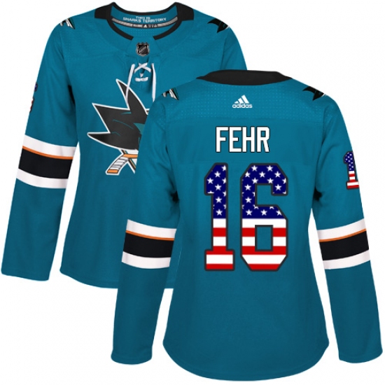 Women's Adidas San Jose Sharks #16 Eric Fehr Authentic Teal Green USA Flag Fashion NHL Jersey