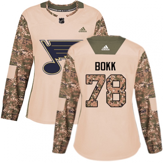 >Women's Adidas St. Louis Blues #78 Dominik Bokk Authentic Camo Veterans Day Practice NHL Jersey