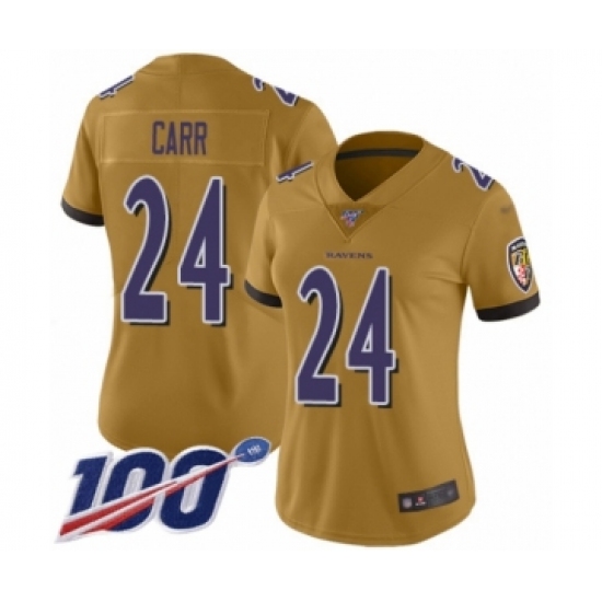 >Women's Baltimore Ravens #24 Brandon Carr Limited Gold Inverted Legend 100th Season Football Jersey