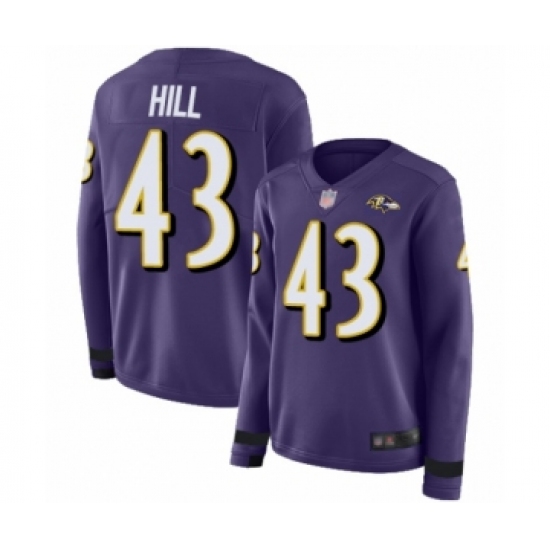 >Women's Baltimore Ravens #43 Justice Hill Limited Purple Therma Long Sleeve Football Jersey