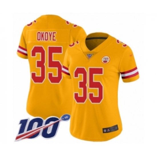 >Women's Kansas City Chiefs #35 Christian Okoye Limited Gold Inverted Legend 100th Season Football Jersey