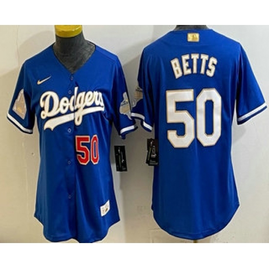 >Women's Los Angeles Dodgers #50 Mookie Betts Blue 2026 Gold Collection Stadium Jersey