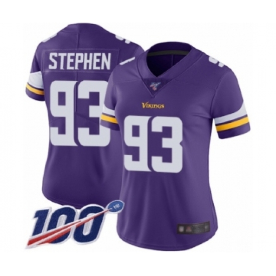 Women's Minnesota Vikings #93 Shamar Stephen Purple Team Color Vapor Untouchable Limited Player 100th Season Football Jersey