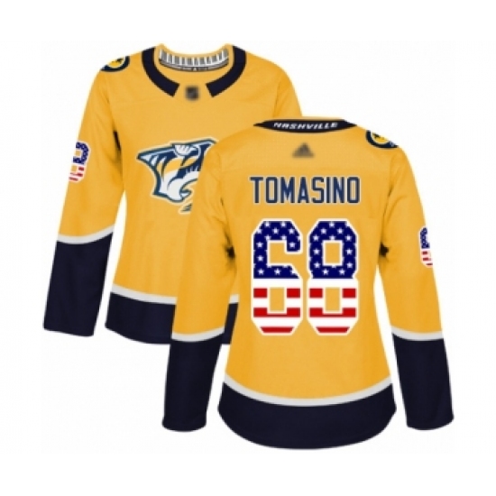 >Women's Nashville Predators #68 Philip Tomasino Authentic Gold USA Flag Fashion Hockey Jersey