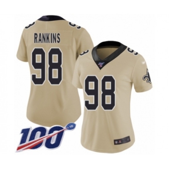 >Women's New Orleans Saints #98 Sheldon Rankins Limited Gold Inverted Legend 100th Season Football Jersey