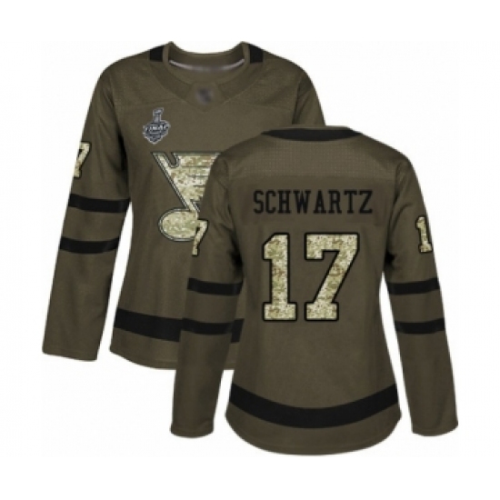 Women's St. Louis Blues #17 Jaden Schwartz Authentic Green Salute to Service 2019 Stanley Cup Final Bound Hockey Jersey