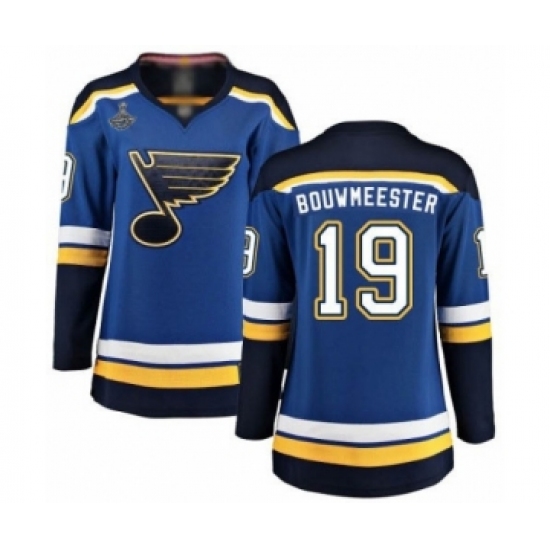 >Women's St. Louis Blues #19 Jay Bouwmeester Fanatics Branded Royal Blue Home Breakaway 2019 Stanley Cup Champions Hockey Jersey
