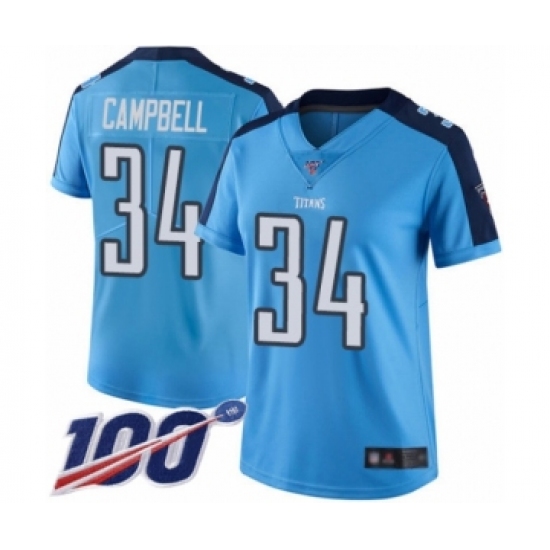 >Women's Tennessee Titans #34 Earl Campbell Limited Light Blue Rush Vapor Untouchable 100th Season Football Jersey