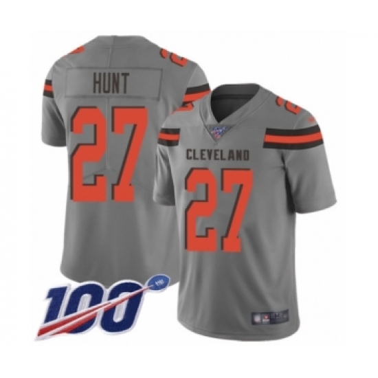 >Youth Cleveland Browns #27 Kareem Hunt Limited Gray Inverted Legend 100th Season Football Jersey