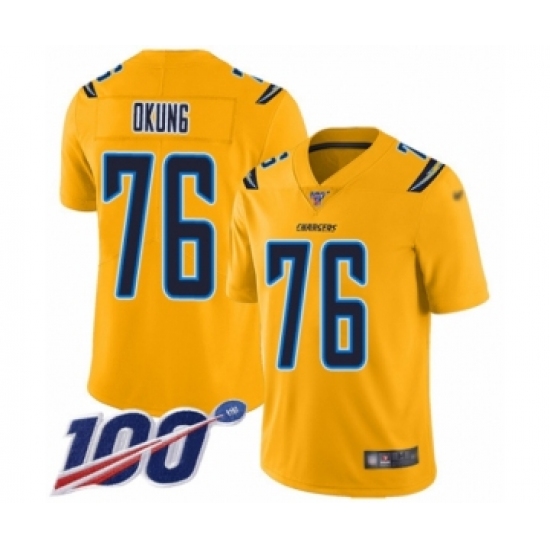 >Youth Los Angeles Chargers #76 Russell Okung Limited Gold Inverted Legend 100th Season Football Jersey