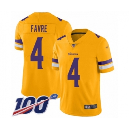 >Youth Minnesota Vikings #4 Brett Favre Limited Gold Inverted Legend 100th Season Football Jersey